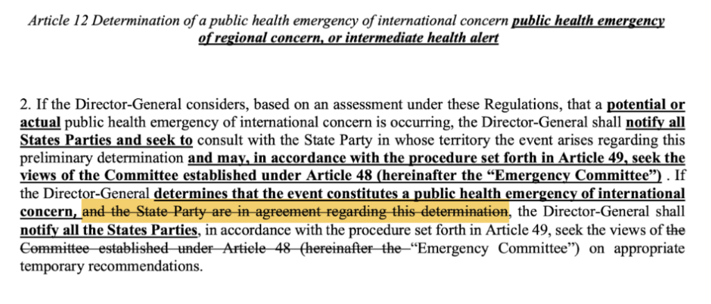 This is further clarified in Article 12 by the removal of any right a sovereign nation has to oppose the declaration of a health emergency within their jurisdiction, see proposed deletion in item 2 (highlighted yellow). By removing the obligation of the Director General to convene an Emergency Committee, and by removing the agreement between the Director General and the Member State. This proposal eliminates the consultation with the Member State party in whose territory the event occurs: