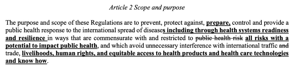 - concerning as they change the nature of the WHO’s recommendations from “non-binding to binding, and giving a binding effect” [Article 1];