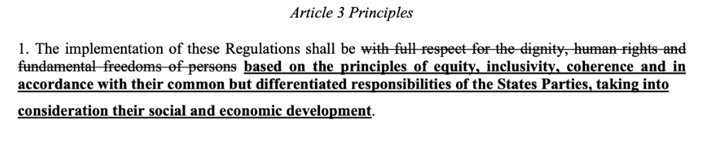 - they defy individual human rights with the removal of the words “full respect for the dignity, human rights and fundamental freedoms of persons” as an overarching principle in the first paragraph, and notes that the concepts of human rights, dignity and fundamental freedoms are clearly defined within the framework of treaties to which many of the States Parties to the Regulations have adhered.” [Article 3]; and
