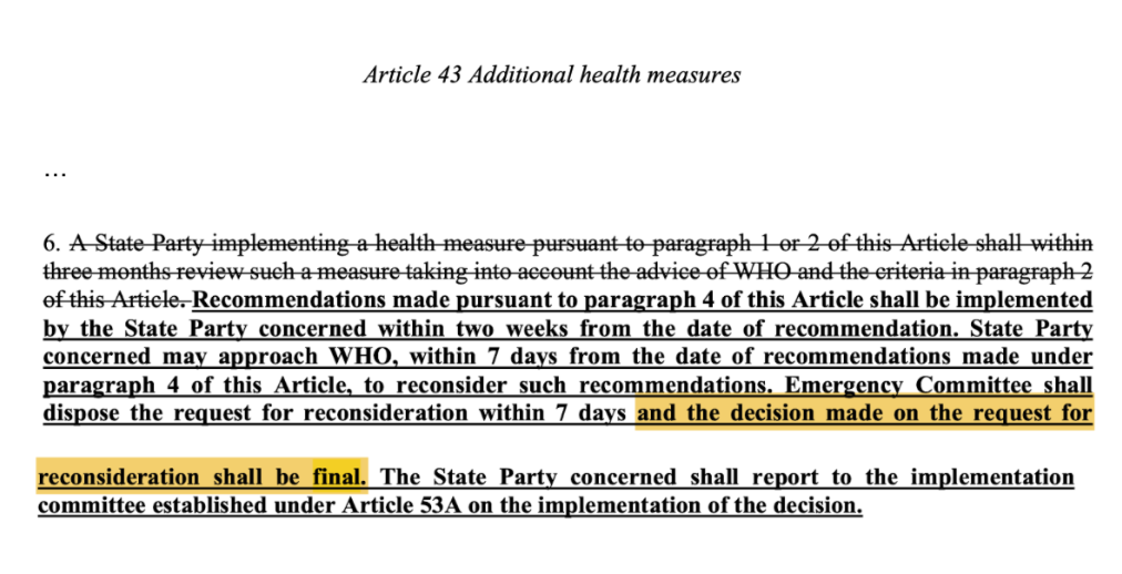 Under the current draft of the 307 IHRAs, the WHO is able to determine an international health concern (of the WHO’s choosing) and that the WHO’s standing recommendations will now be BINDING – that is each Member States has to comply. At present the 2005 IHRs expressly state the WHO’s standing recommendations are “non-binding”, ie the WHO’s advice are recommendations only – member states could choose to follow the recommendations or not.